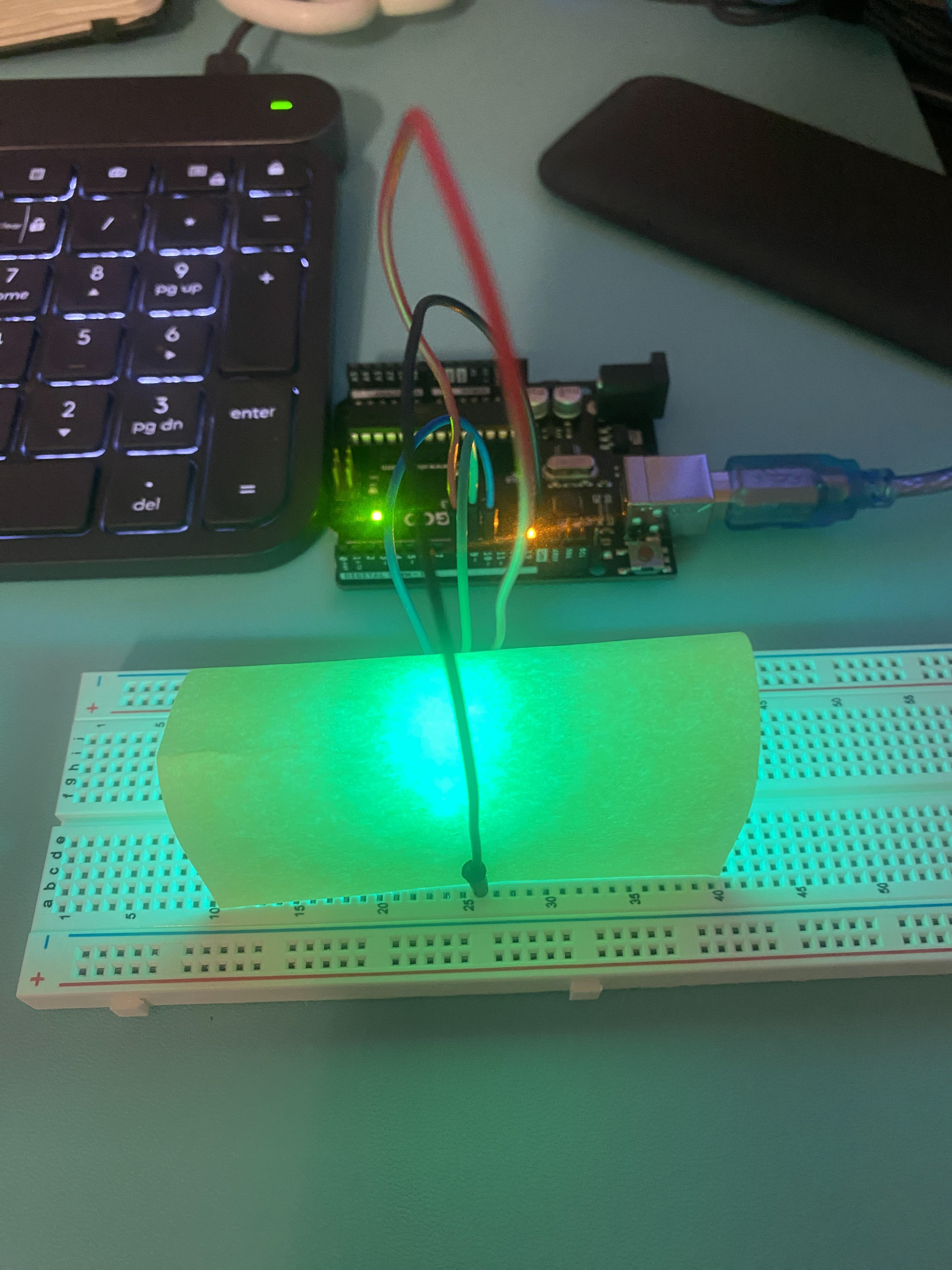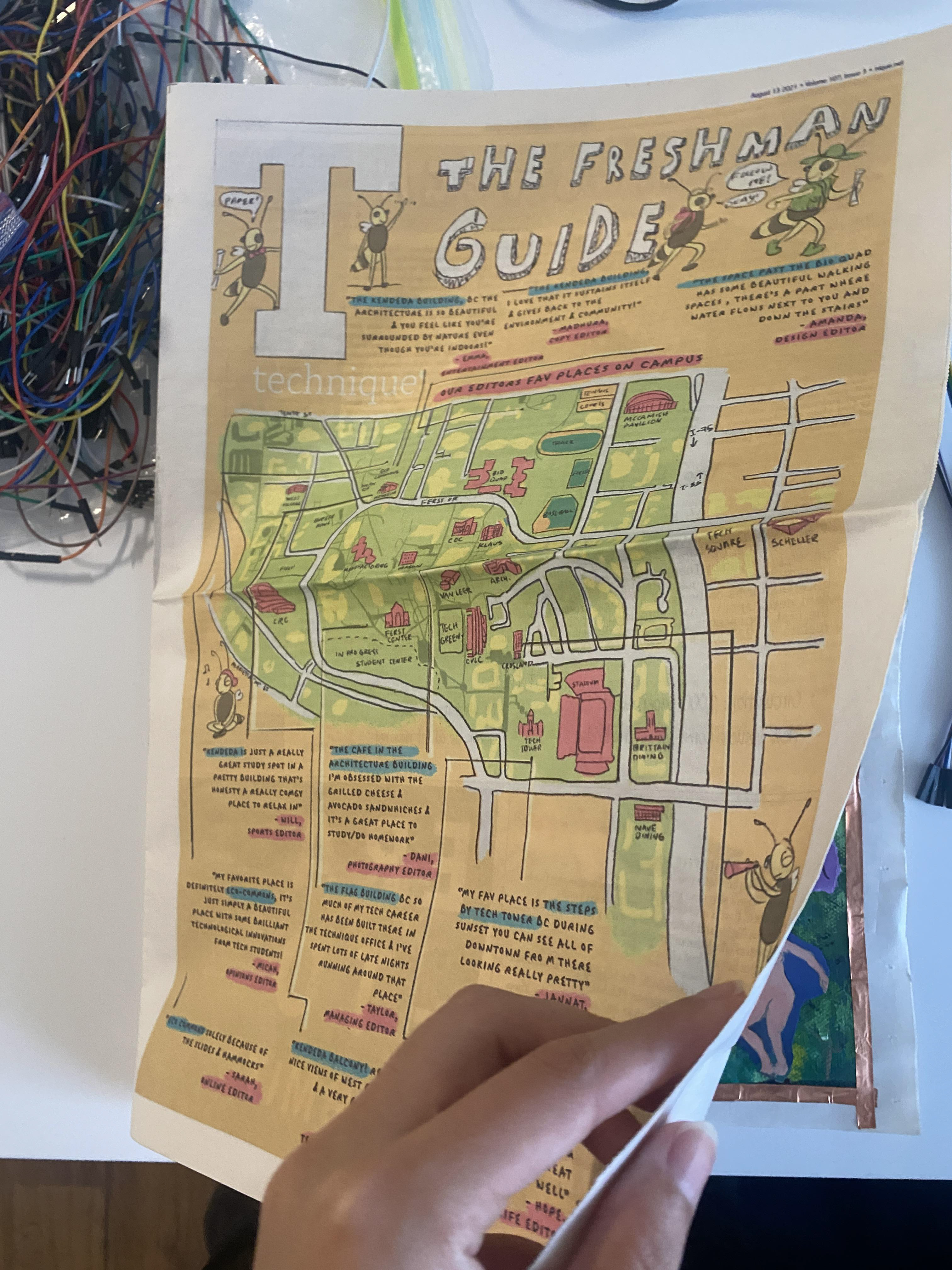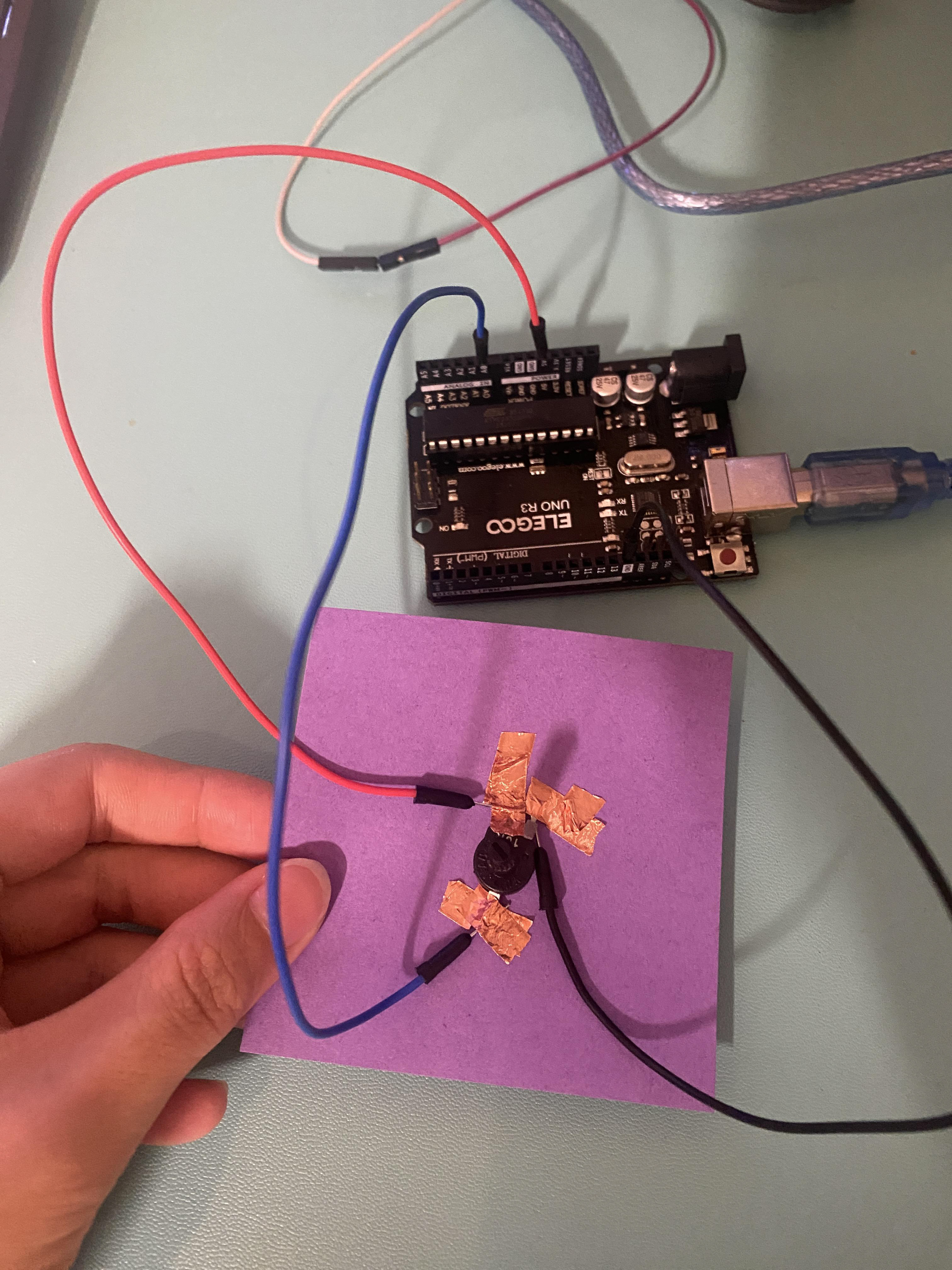 In terms of visual aesthetics, I created a nature-themed canvas painting using acrylic paint (refer to the photos below). Originally, I envisioned attaching the Arduino to either the newspaper or the canvas. However, after numerous trials and errors, I discovered that the potentiometer was too fragile and impractical in such a setup (as depicted in the bottom right image of my prototype). Consequently, I had to pivot to using the breadboard and affixing it to the newspaper.